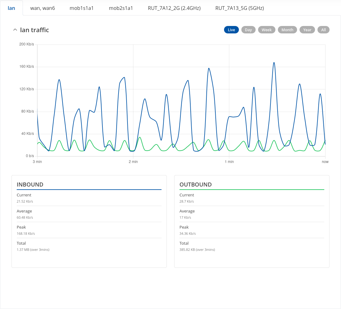 The Realtime Traffic graphs provide users with the possibility to monitor average inbound and outbound traffic over the course of *period. Each new measurement is taken every 3 seconds for Live data. The graphs consist out of two color coded graphs: the green graph shows the outbound traffic, the blue graph shows the inbound traffic. Although not graphed, the page also displays peak loads and averages of inbound and outbound traffic.
