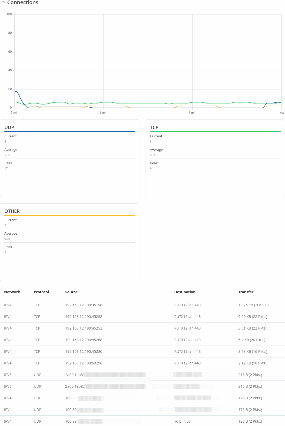 The Realtime Connections graph displays currently active network connections with the information about network, protocol, source, destination addresses and transfer speed. The table below the graph displays basic information on active connections.