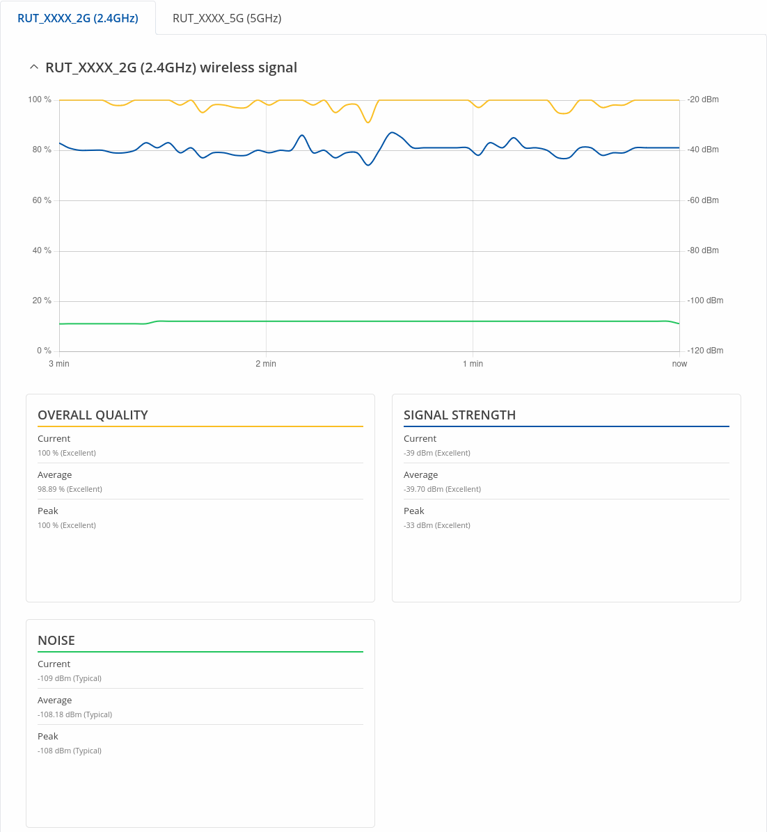 The Realtime Wireless graph displays the wireless radio signal strength (blue), signal noise (green) and overall quality (yellow).