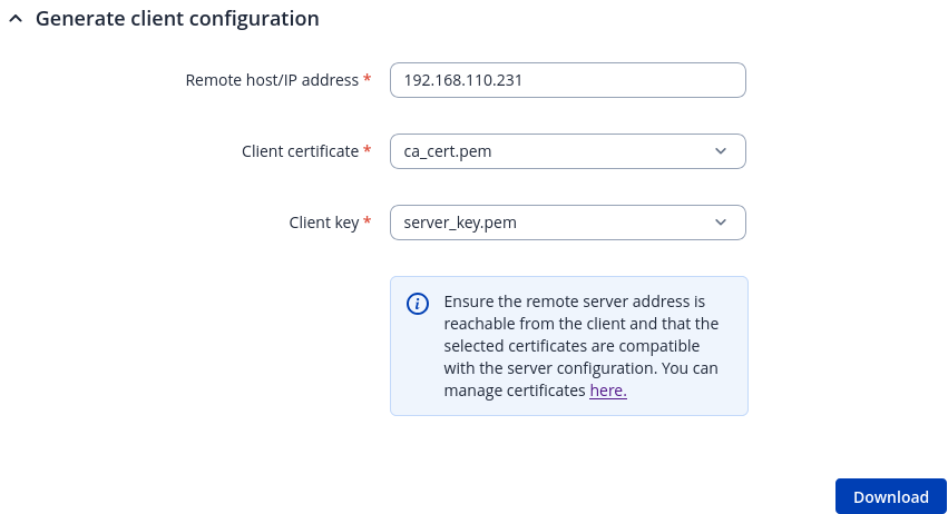 | Client certificate | .crt file | The certificate will be added to the generated client configuration file. |