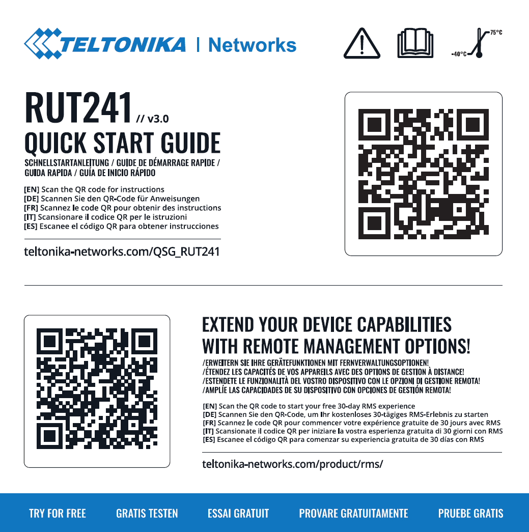 RUT241 devices manufactured starting from Q3 2023 will have a new QSG flyer in the packaging. The new QSG flyer includes multiple languages, English, German, Spanish, French, Italian, the short version of QSG with a QR code/link to the full Web QSG version: teltonika-networks.com/QSG_RUT241