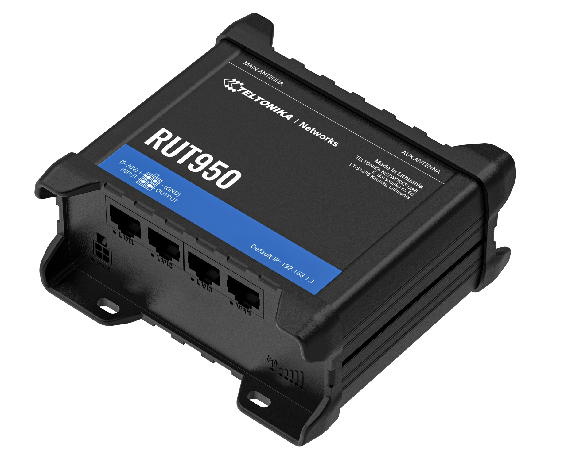 RUT950 is a compact industrial 4G (LTE) router equipped with 4x Ethernet ports, WiFi, Dual-SIM and RutOS software for advanced networking solutions.
