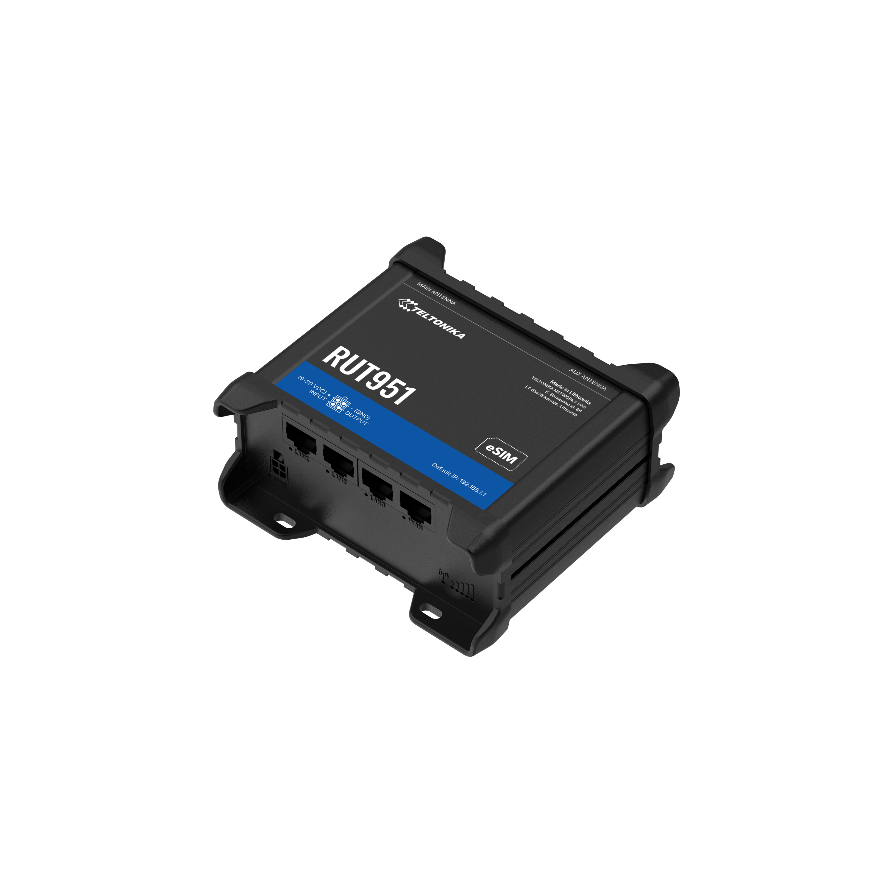 RUT951 is a compact industrial 4G (LTE) router equipped with 4x Ethernet ports, WiFi, Dual-SIM and RutOS software for advanced networking solutions.