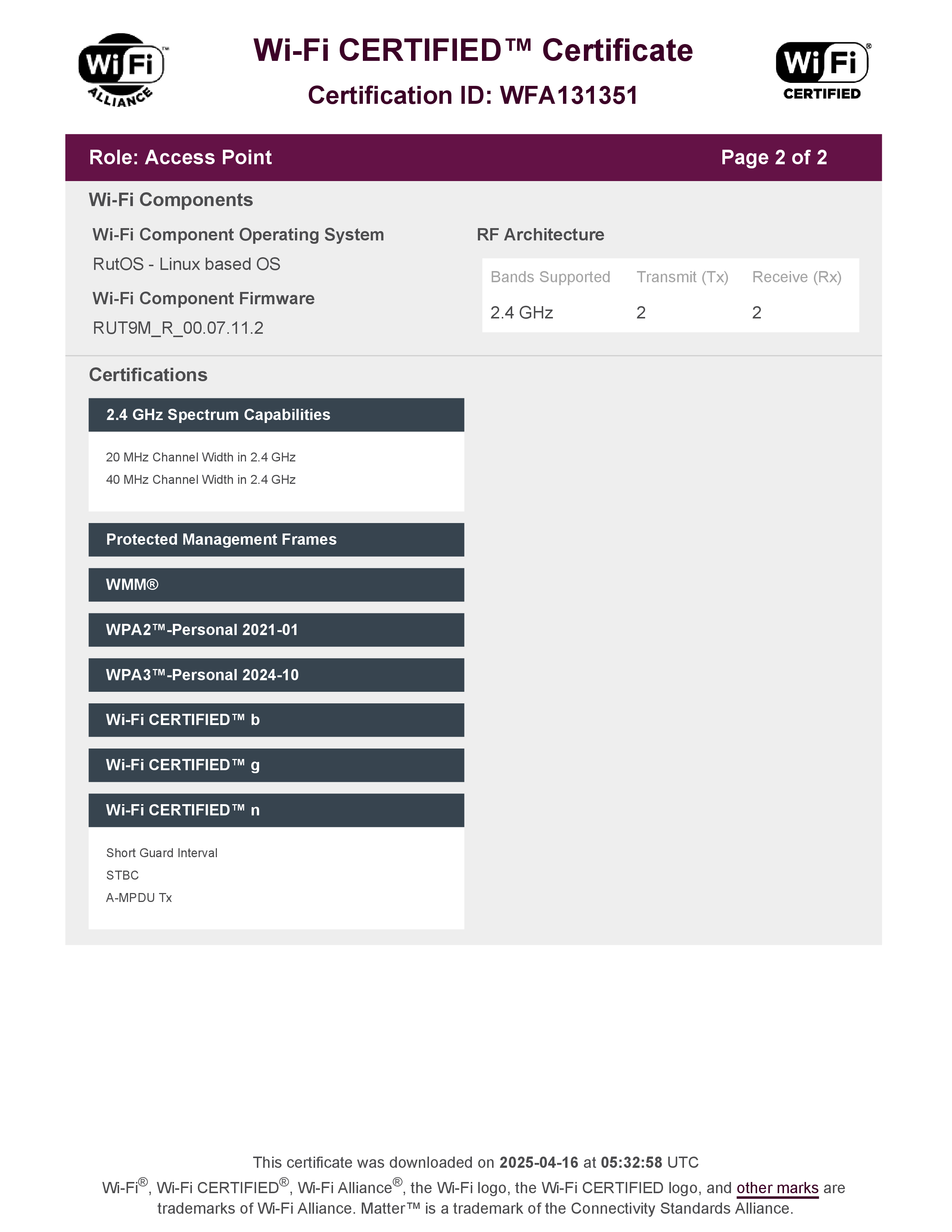 | RUT956 Certification ID: | WFA131351 |