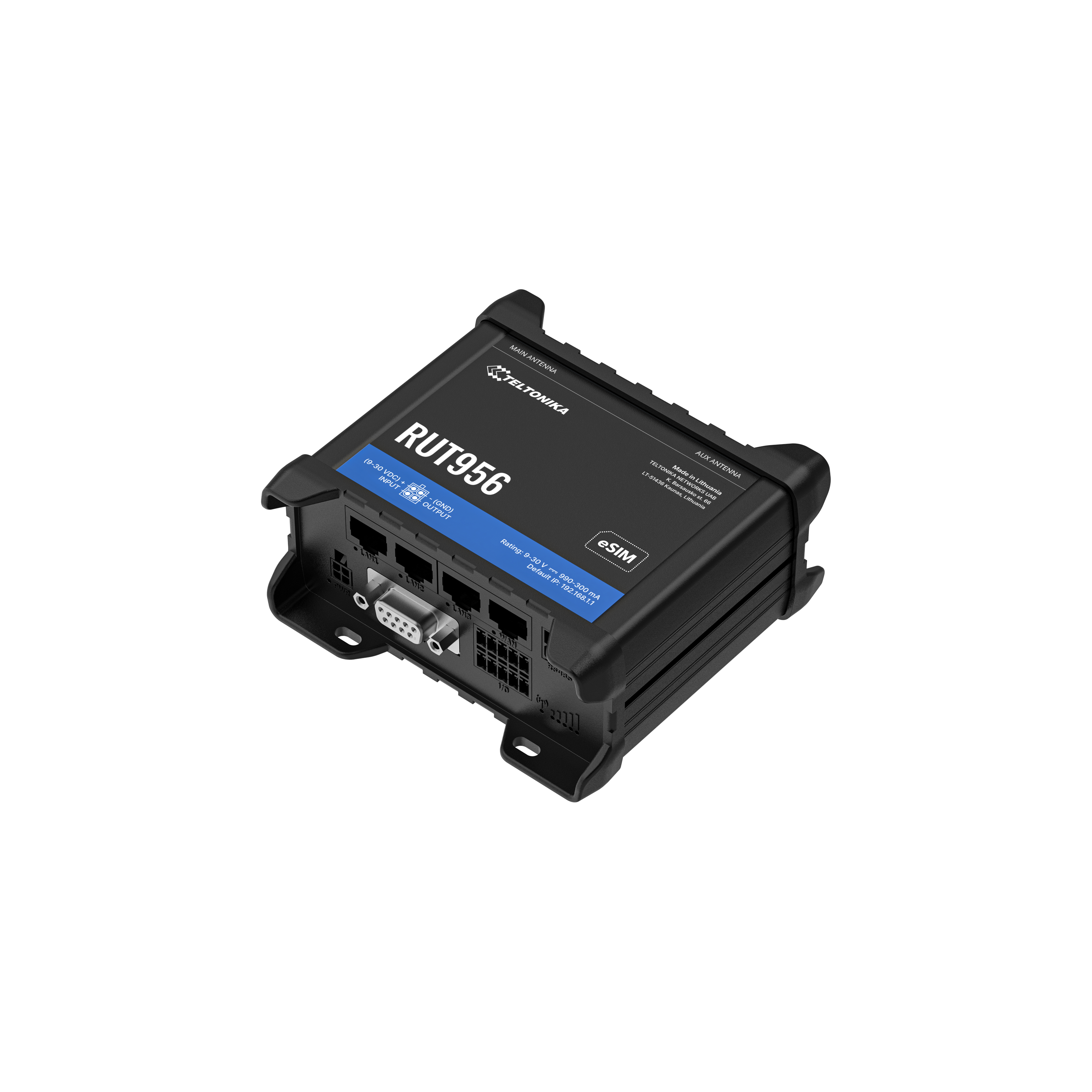 RUT956 is a compact industrial 4G (LTE) router equipped with 4x Ethernet ports, WiFi, Dual-SIM, GPS, an I/O connector block, RS232/RS485 and RutOS software for advanced networking solutions.