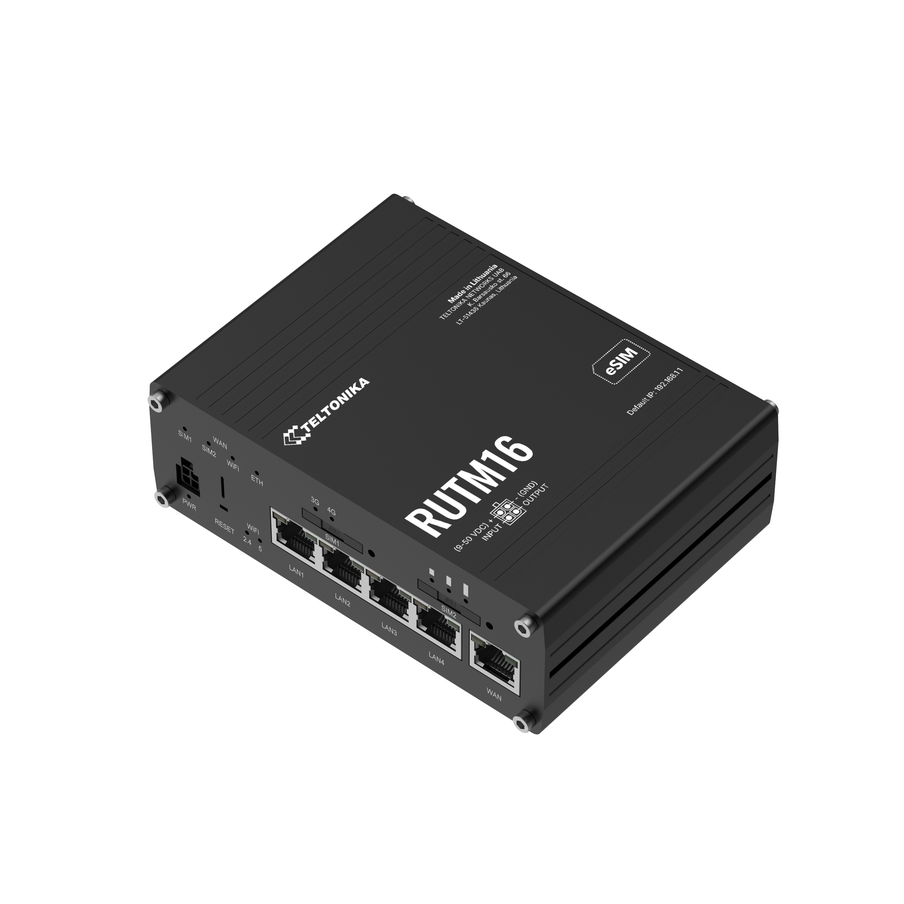 RUTM16 is a versatile LTE router engineered for worldwide deployments. Ensure reliable global operation with its Telit modem, which provides Cat 6 speeds and coverage across multiple markets. For maximum versatility, connect IoT and industrial setups via robust 5x Gigabit Ethernet and USB ports, and enjoy stable wireless access with Dual-band Wi-Fi 5 featuring Mesh and Fast Roaming. Use the integrated eSIM to eliminate site visits by managing carrier profiles at scale. The RUTM16 is the ideal 4G router for large-scale applications like robotics, transport, roadside infrastructure, and POS terminals.