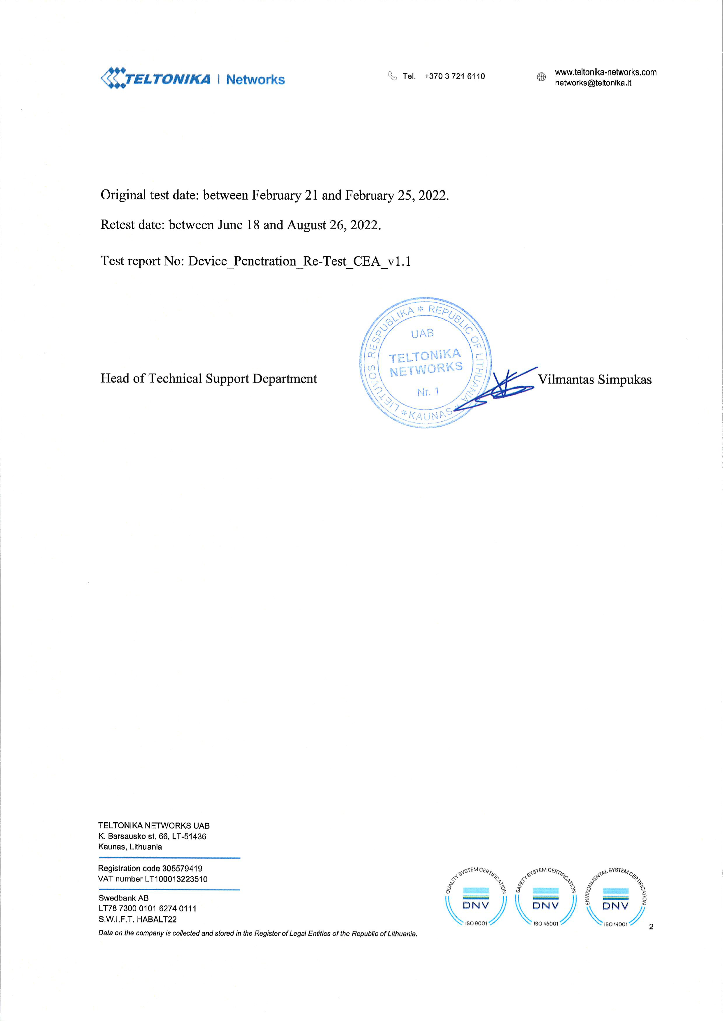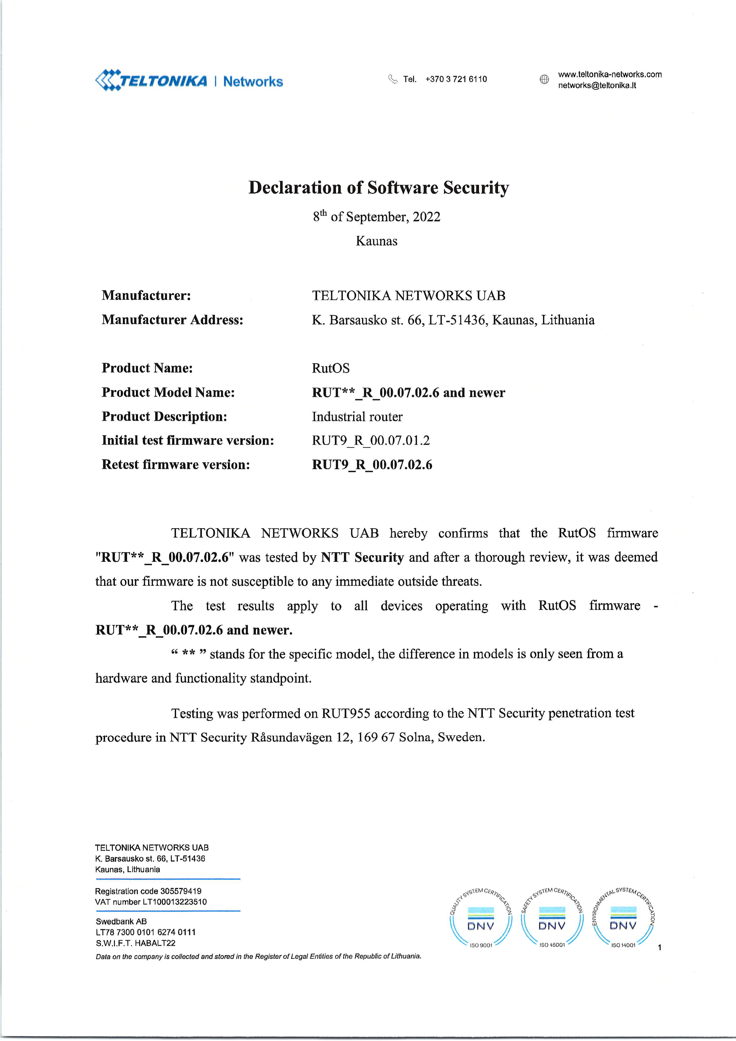 Teltonika’s RutOS firmware "RUT**_R_00.07.02.6" was tested by NTT Security and after a thorough review, it was deemed that our firmware is not susceptible to any immediate outside threats.