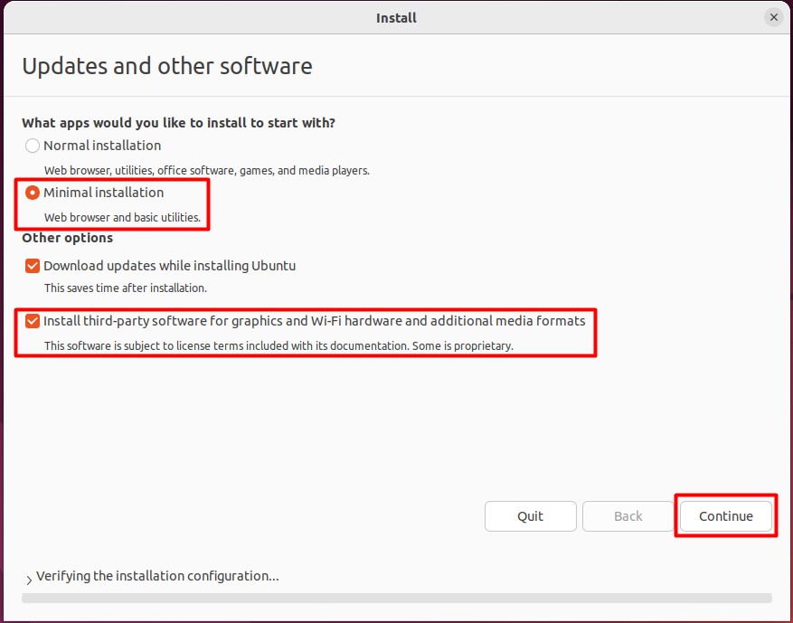 6. Choose Minimal installation and check Install third-party software for graphics and Wi-Fi hardware and additional media formats.