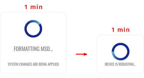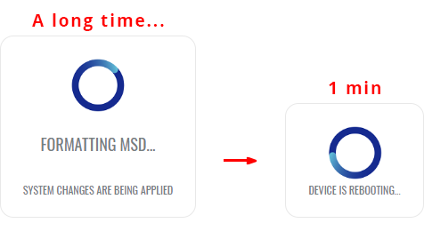 - the entire procedure may take a very long time and includes a reboot at the end; exact time will vary depending on the size of the MSD (larger size will take longer; for example, using a 128 GB drive will take about 2 hours to fully set up, while a 16 GB will only take about 5 minutes).