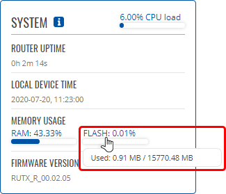 - Your device's flash memory will be expanded once the reboot has finished. In order to check, log in to the WebUI and look to the 'System' widget in the 'Overview' page. Hover your mouse cursor over the 'FLASH' memory indicator; you should see an increase to the device's flash memory.