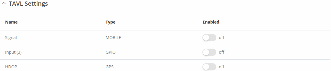 The TAVL settings section is used to select which data will be sent to the TAVL server: