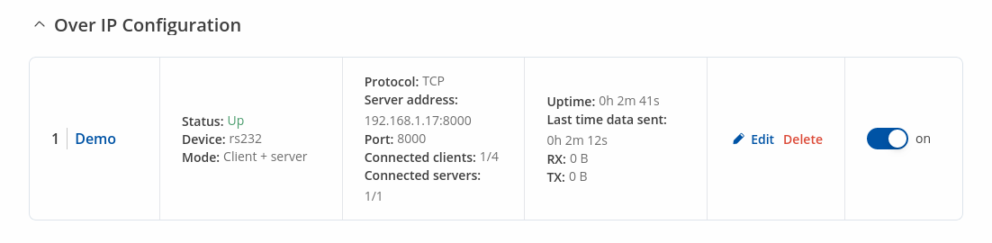 You can configure network related parameters of the serial connection in the Over IP Configuration secion.