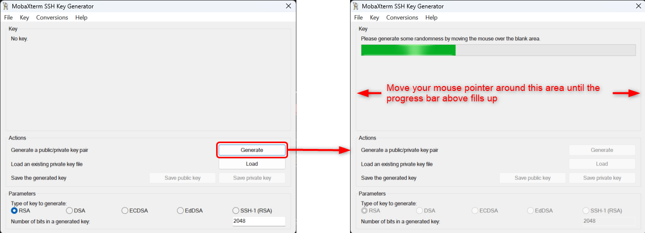 In the opened window, click on "Generate" button to begin key generation. A progress bar will appear at the top of the window. Move your mouse pointer around the grey are to generate the key until the progress bar fills up: