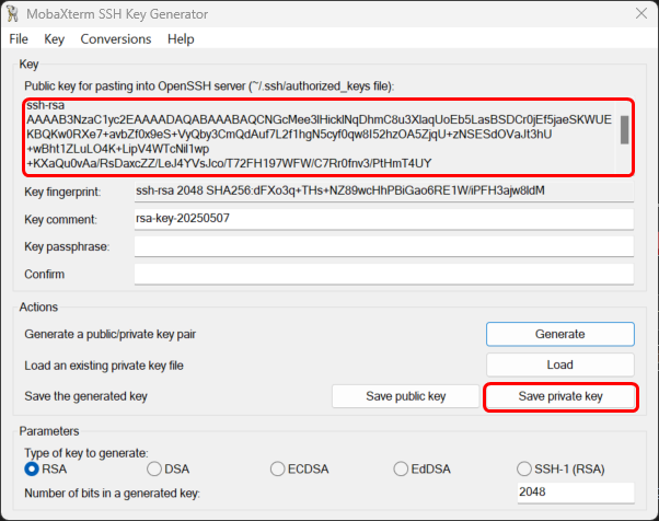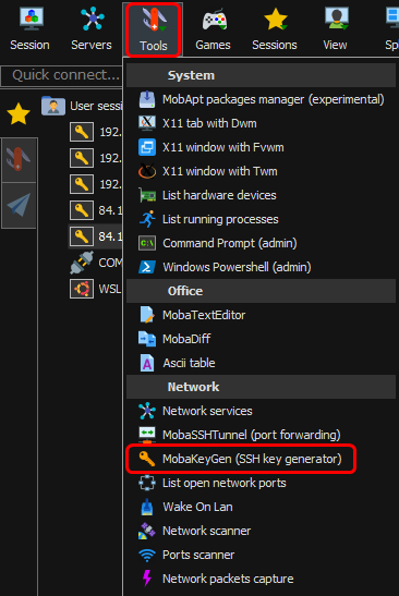 First, we'll need to generate the rsa key. For this we'll use MobaKeyGen (SSH Key Generator) - a key generator tool for MobaXTerm on Windows. It will be installed along with MobaXTerm automatically as a tool. The key generator can be found by navigating to the Tools → MobaKeyGen.