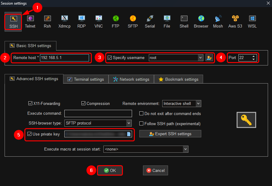 - Remote host - Enter routers IP address