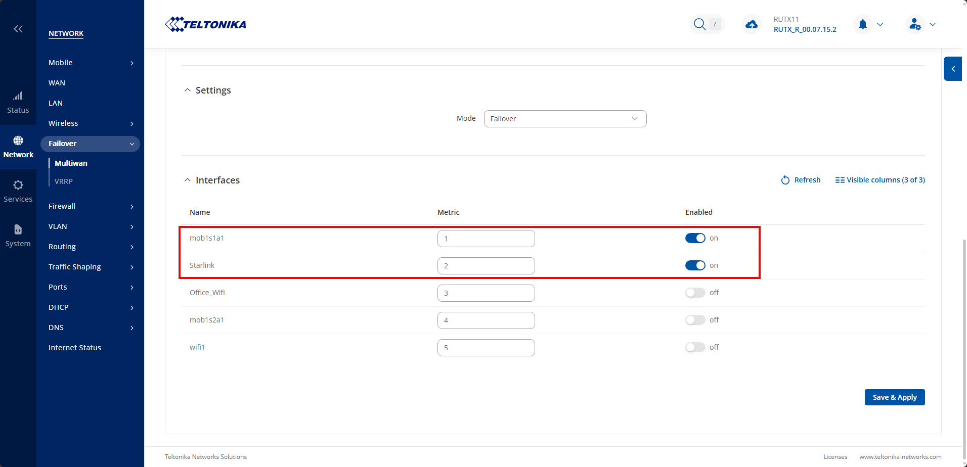 Next arrange the connection order by simply changing the Metric value of "WAN" to "1" and "mob1s1a1" to "2". This sequence determines the order of priority for the connections.