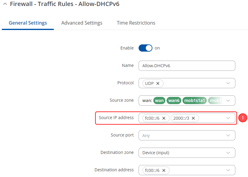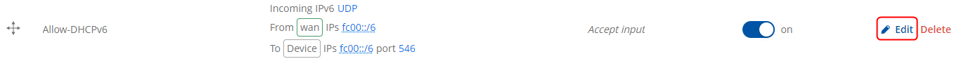 Go to your devices WebUI → Firewall → Traffic Rules → Edit Allow-DHCPv6 rule