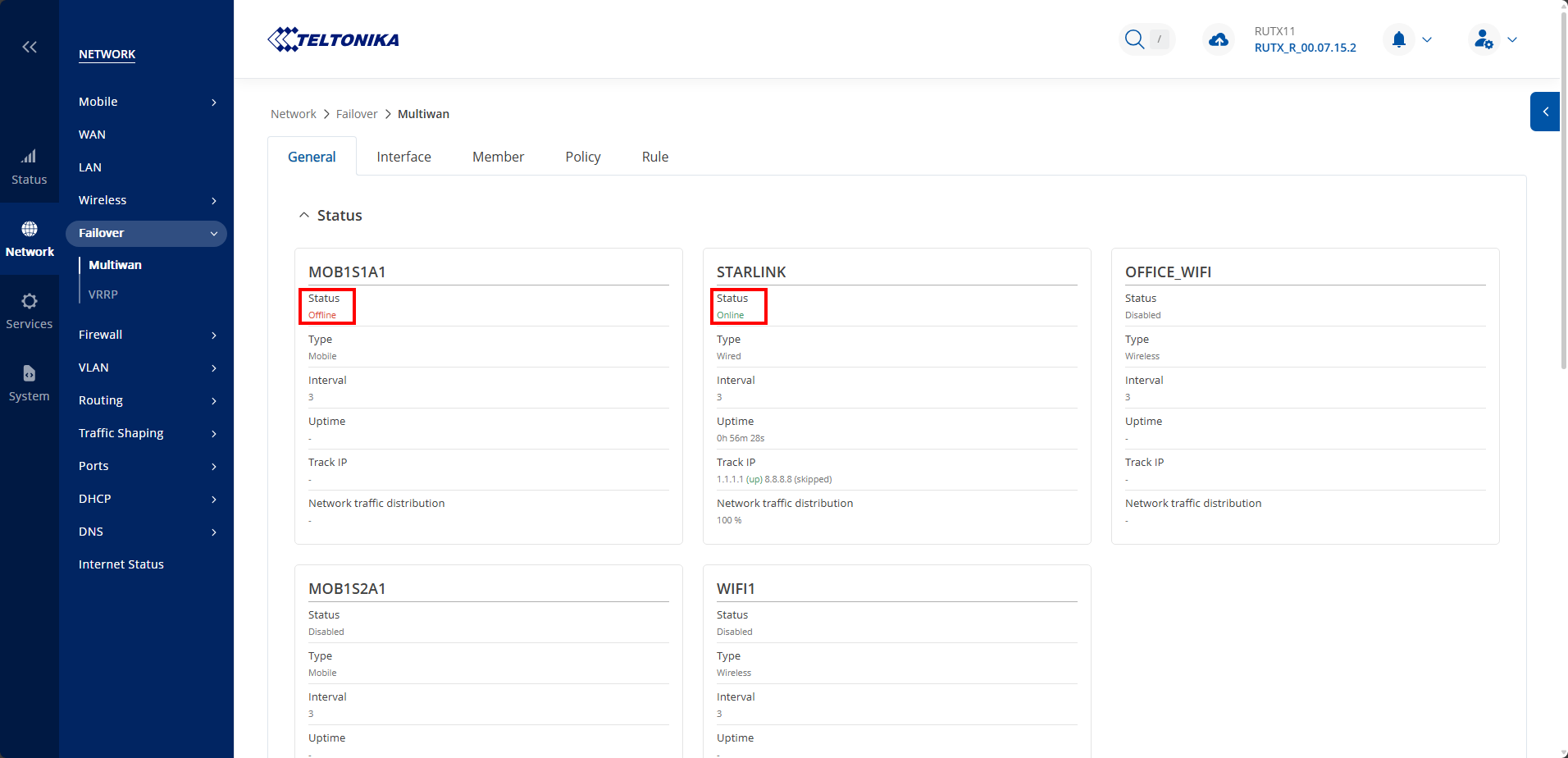 Firstly, In the WebUI, navigate to Network → Failover →Multiwan. In this section, you should observe two entries: " WAN," which represents your starlink connection, and "mob1s1a1", which corresponds to your Teltonika Networks router. Both of these entries should be indicated as online.
