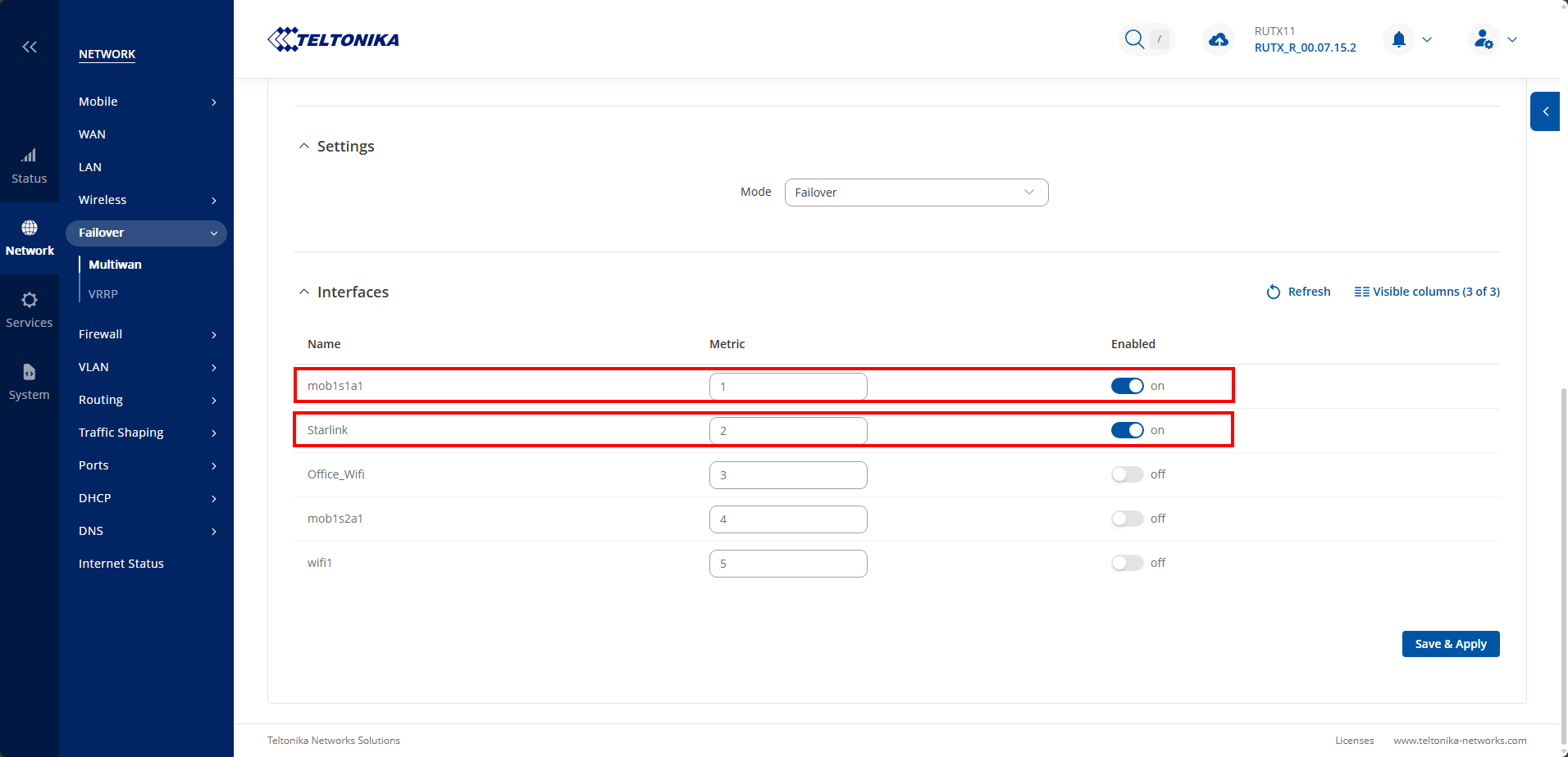 In the Network → Failover → Multiwan → Interface section, configure the failover rules for both connections as follows:
