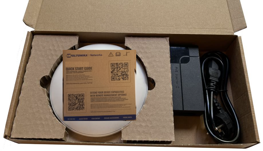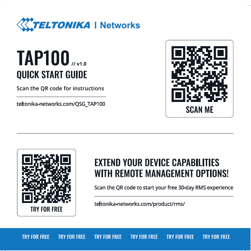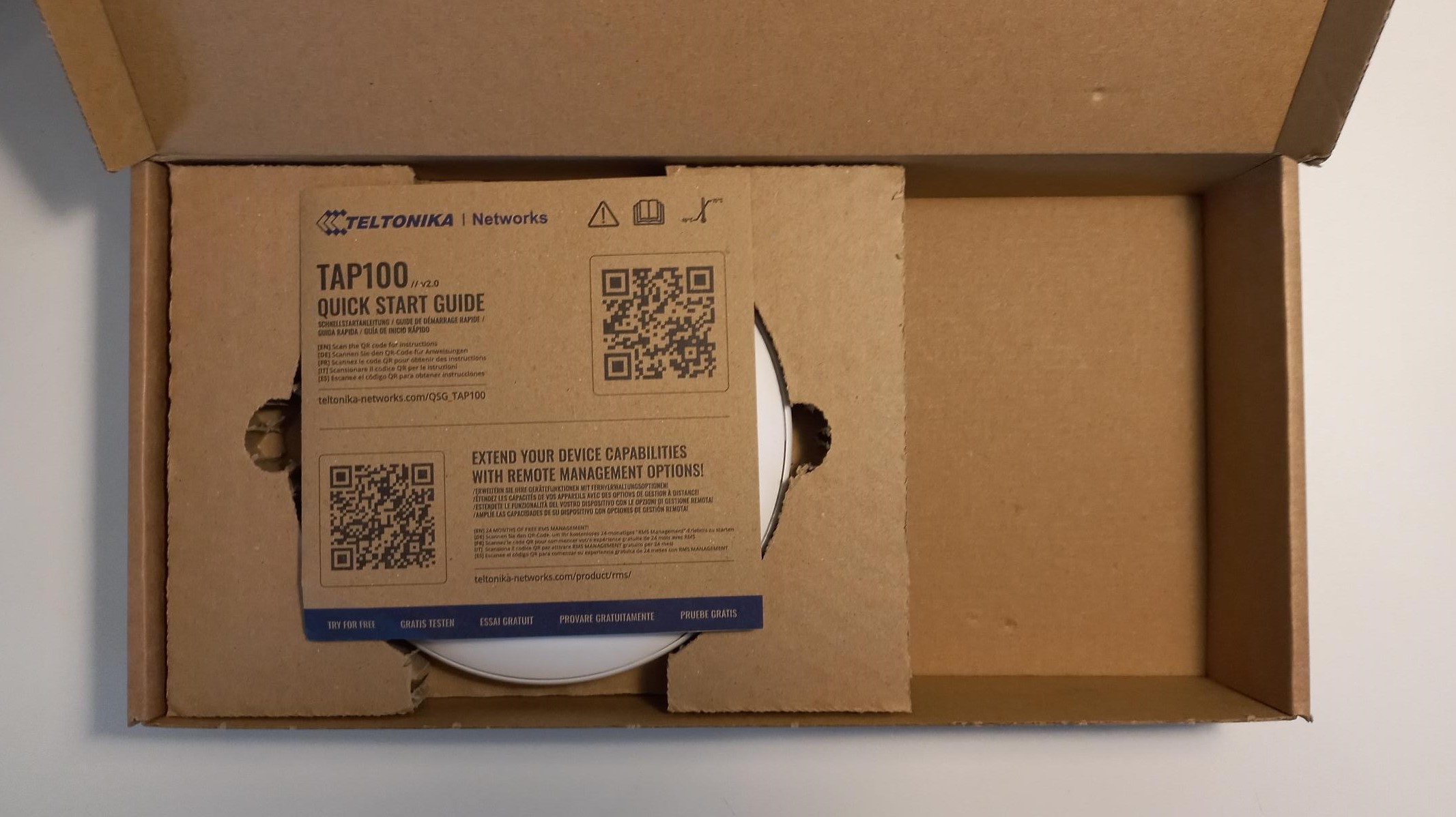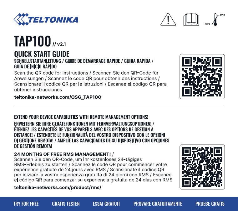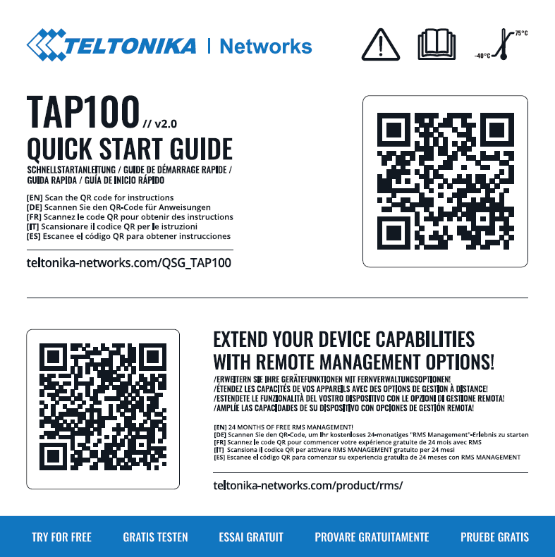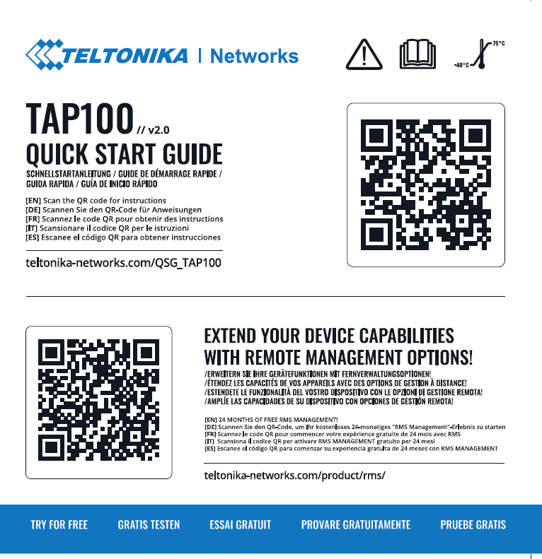TAP100 devices manufactured starting from Q3 2023 will have a new QSG flyer in the packaging. The new QSG flyer includes multiple languages, English, German, Spanish, French, Italian, the short version of QSG with a QR code/link to the full Web QSG version: teltonika-networks.com/QSG_TAP100