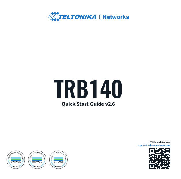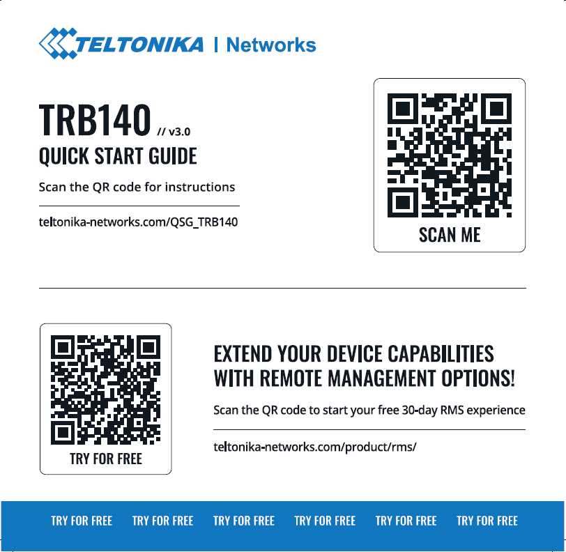 TRB140 devices manufactured starting from Q4 2022 will have a new QSG flyer in the packaging. The new QSG flyer includes the short version of QSG with a QR code/link to the full Web QSG version: teltonika-networks.com/QSG_TRB140