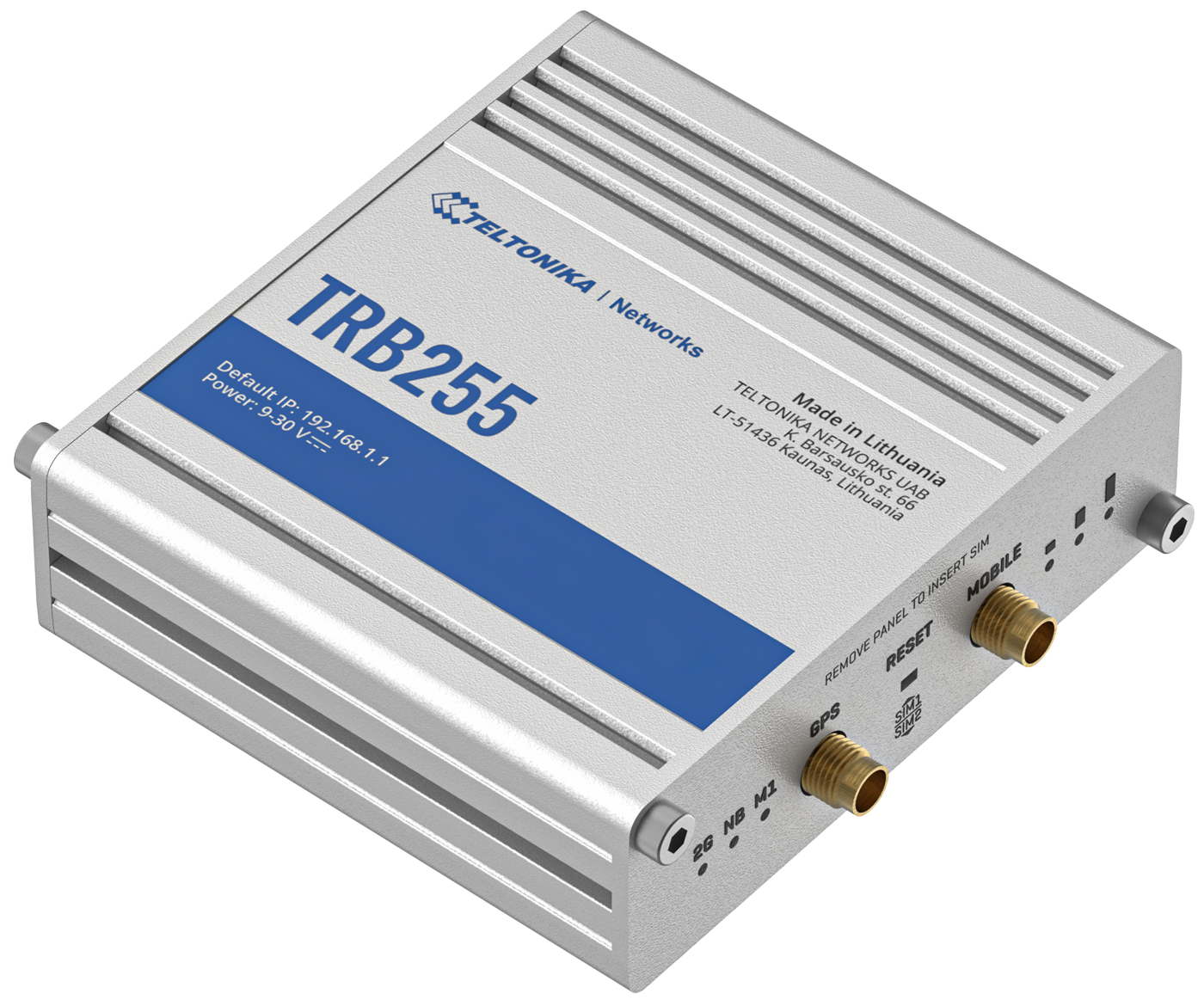 TRB255 is a compact industrial LTE Cat M1/NB-IoT/EGPRS gateway equipped with an Ethernet port, a connector block which includes pins for I/O, RS232, RS485, GPS and RutOS software for advanced networking solutions.