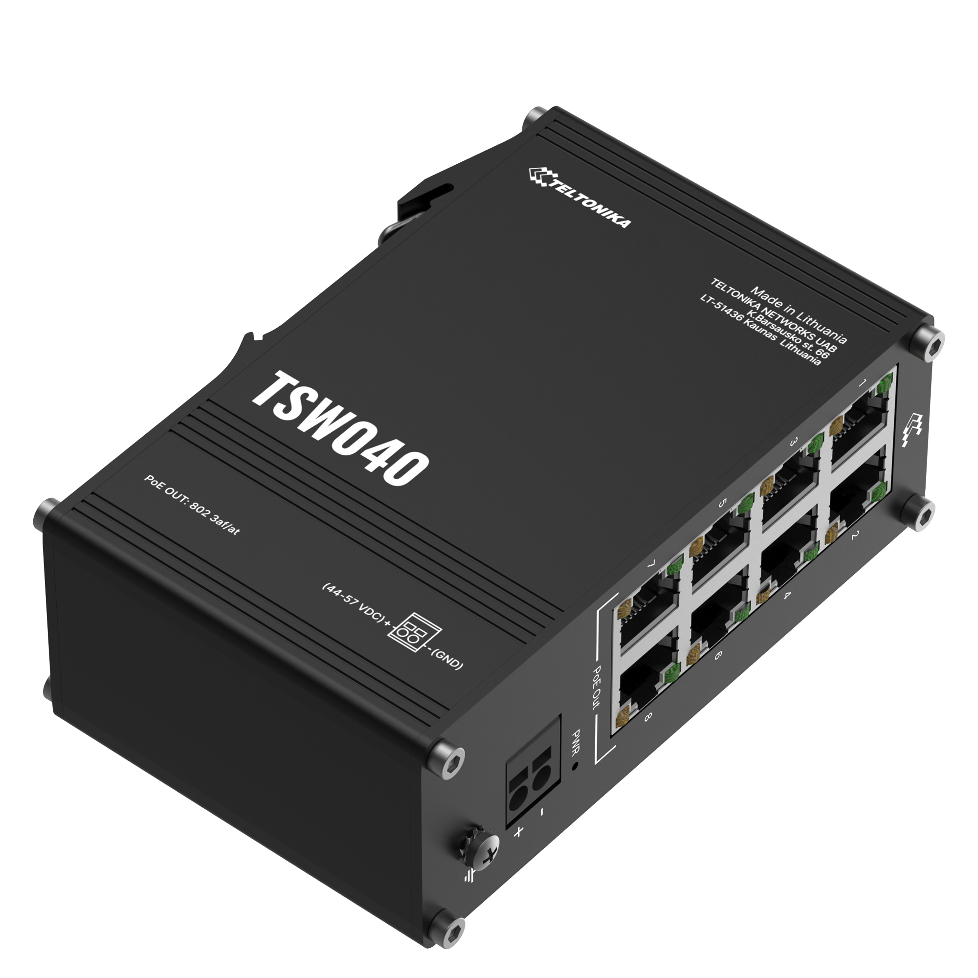 TSW040 is an unmanaged 8-port PoE+ switch by Teltonika, featuring eight RJ45 ports with a total power budget of 240 W, or up to 30 W per port. This compact and rugged 8-port switch also features a 2-pin power input and an integrated DIN rail for easy mounting, making it ideal for industrial applications. The TSW040 has a wide voltage range of 7-57 VDC and a PoE-out voltage range of 44-57 VDC.