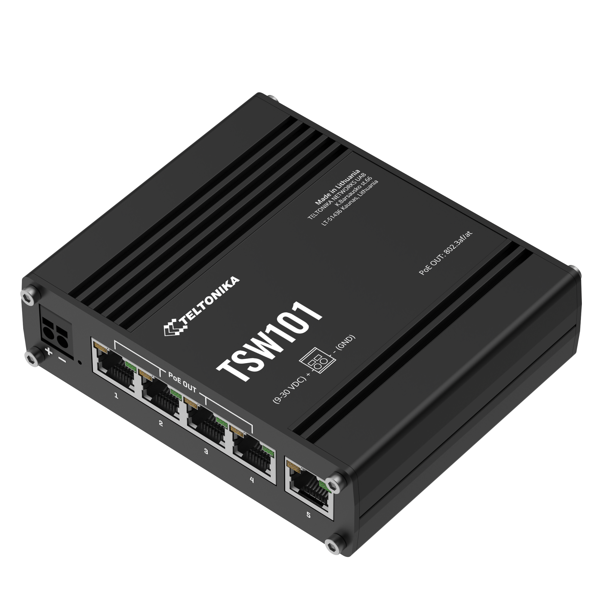 TSW101 is a robust industrial grade switch with 5x Gigabit Ethernet ports, 4 of which can be used to power connected devices via PoE 802.3af/802.3at standards, and a 2-pin power socket for automotive applications.