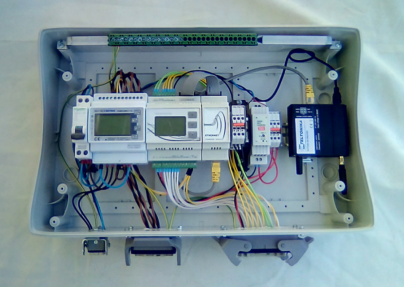 The customer came up with the Neurtura - a custom monitoring device that would suit their needs. The Neurtura is comprised of a magnetothermic, an electric power analyzer, the Industruino D21G IND I/O with its Ethernet module next to it, a 24 Volt power supply and a Teltonika RUT230 router used for remote Firmware updates.