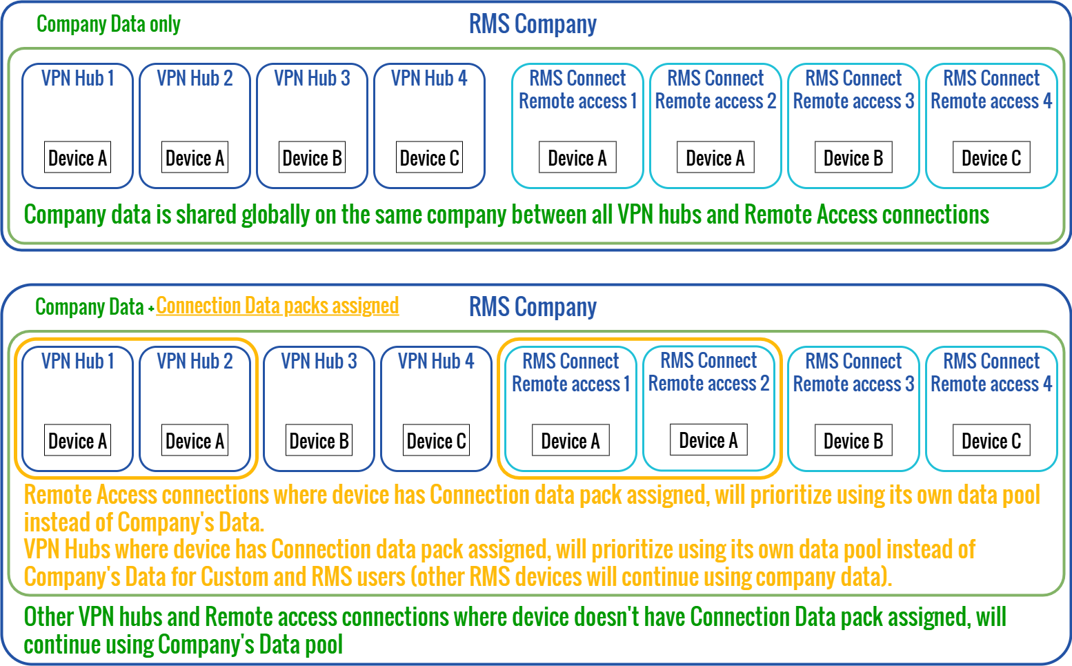 Connection data packs are an alternative to Company data if you expect a lot of traffic going through a RMS Connect session on a specific device or RMS VPN hub to which that device is assigned. A device with active data pack will have its own data pool that would take higher priority than the company data pool and will be active for a specified time period.