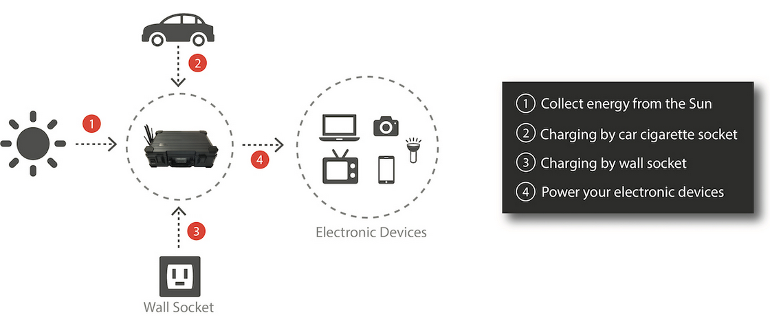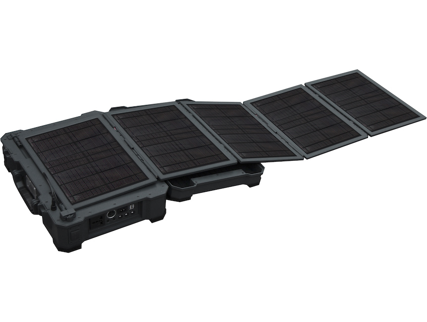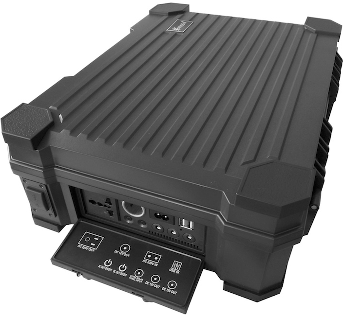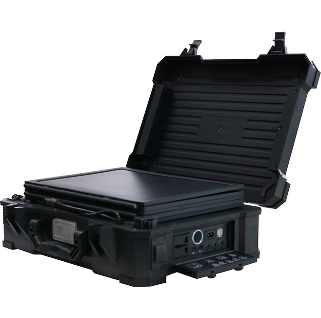 The case is powered by a 12 V 50 Ah battery that can be charged with 5 solar panels, which provide unlimited power if deployed in daylight. It can also be charged via a 230 V connector or a special 12 V connector.
