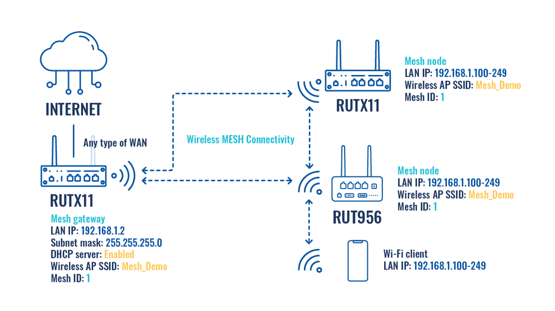 - One router has to be connected to the internet. It will act as a Mesh gateway and DHCP server.