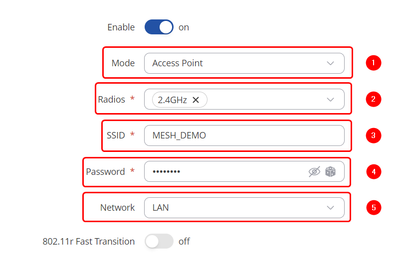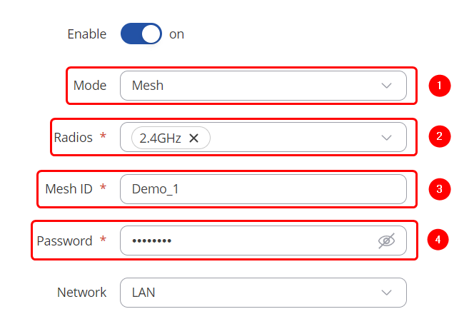 The following settings need to be applied to all of the routers in the wireless mesh network including mesh gateway and nodes.