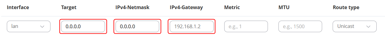 button to create a new static route under the IPv4 routing section. - In the route setup, configure the following: Target – 0.0.0.0, IPv4 Netmask – 0.0.0.0, IPv4 Gateway – enter the LAN IP address of the mesh gateway.