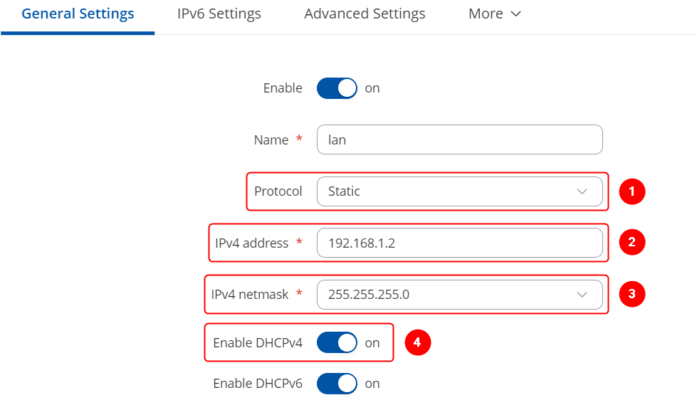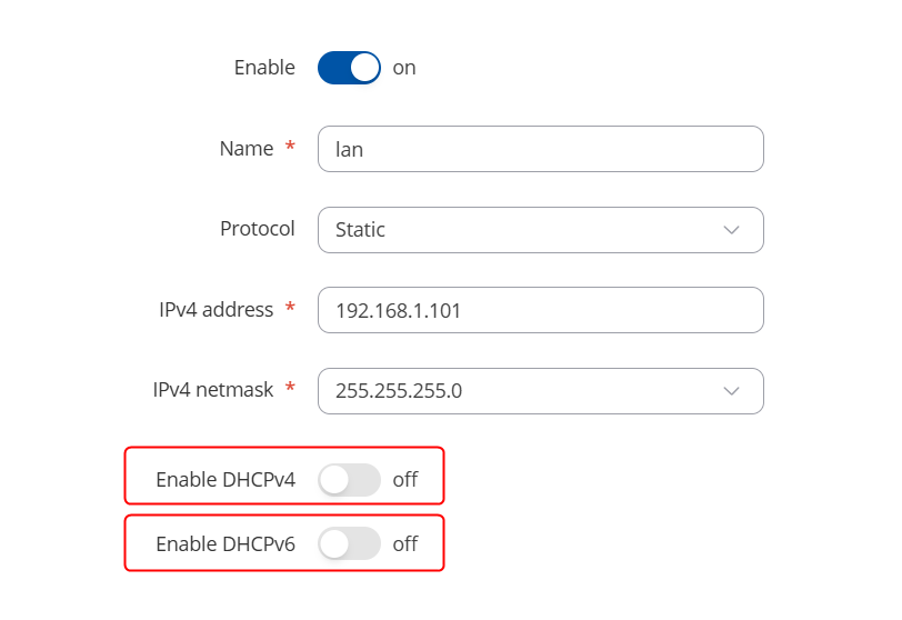 icon on the right of the LAN interface. - Make sure Enable DHCPv4/v6 is disabled.
