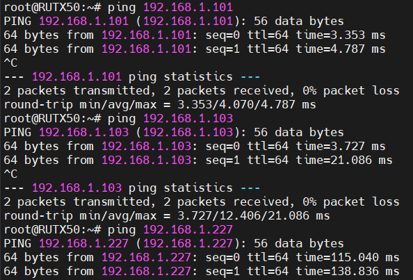 The test setup uses two RUTX11 routers, one RUT956 router and a smartphone for testing purposes. One of the RUTX11 devices has access to the internet. Wired WAN connectivity is used, however, any type can be employed. Upon successful configuration, all mesh devices should be able to communicate with each other either directly of through other devices in the mesh, thus allowing to increase Wi-Fi coverage radius.