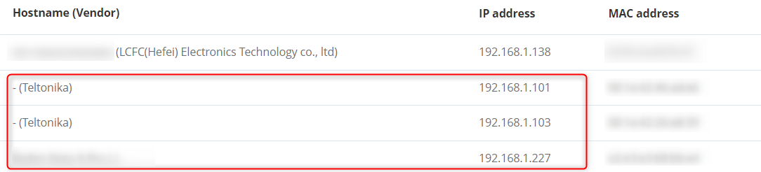 icon. In the screenshot, IP addresses can be seen provided to the two RUT routers as well as a device, connected to the access point, which is a smartphone in this case.