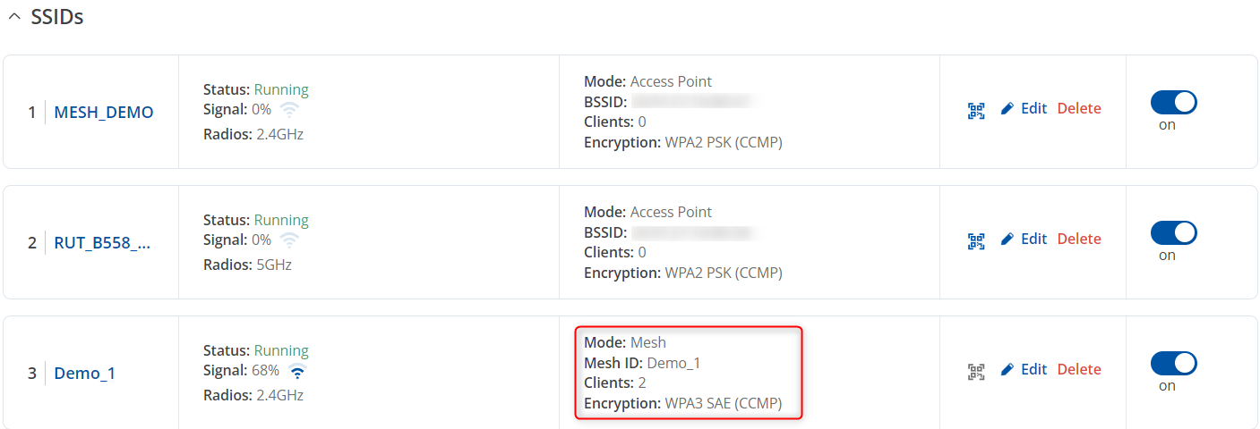 - Navigate to Network → Wireless. The mesh interface, in this case "1", shows the number of connected mesh nodes, which is 2 and indicates the cpnfigures RUTX11 and RUT956.