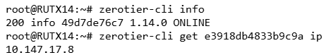 Check ZeroTier interface IP address with this command (replacing <network> with the ZeroTier Network ID):zerotier-cli get <network> ip