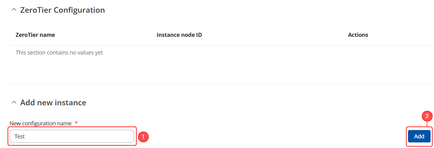 - Navigate to the Services → VPN → ZeroTier page and create a new ZeroTier configuration.