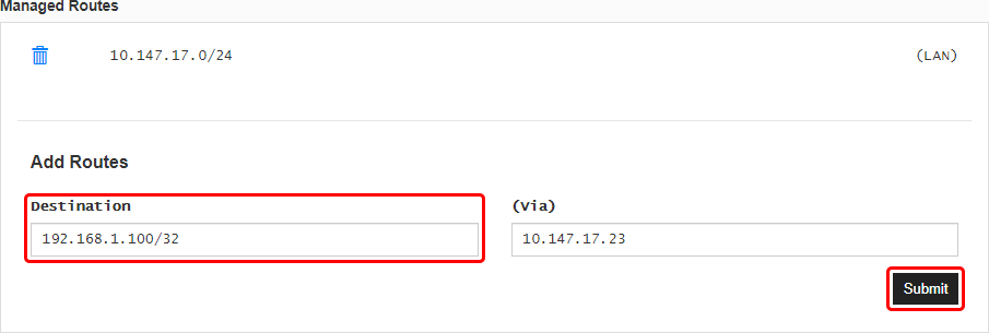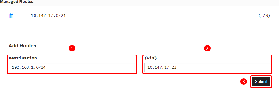 - Specify 10.147.17.23 (Teltonika device ZeroTier IP) in the 'via' field.
