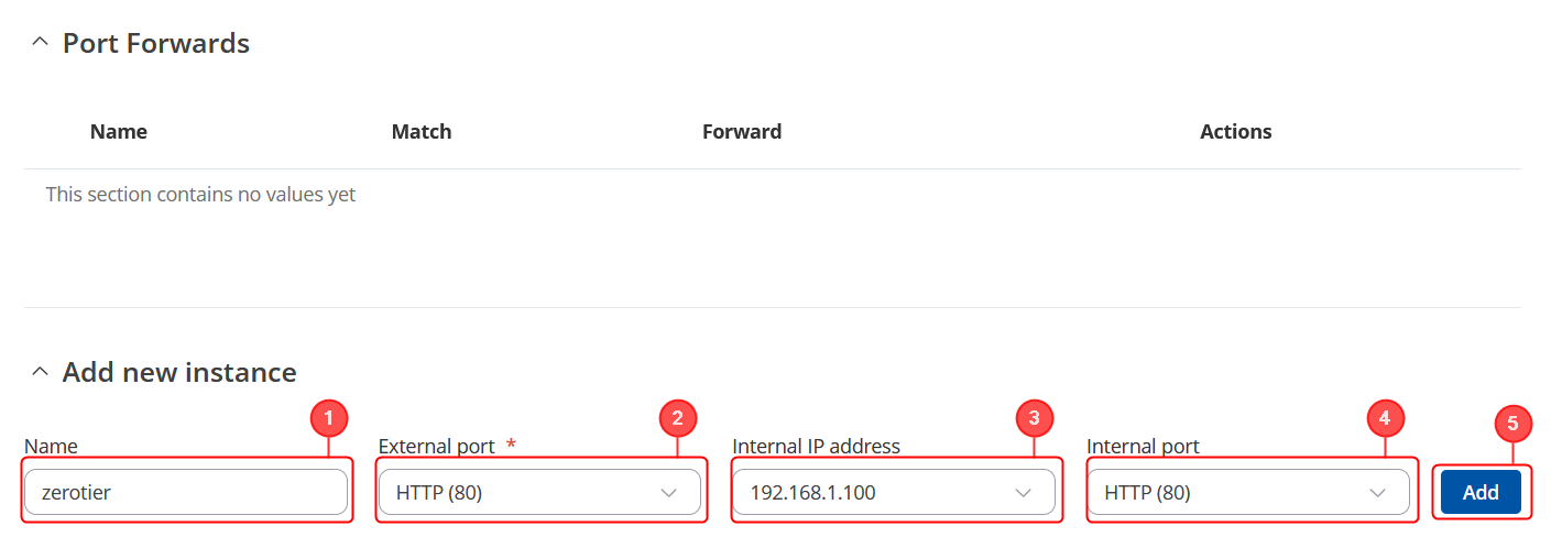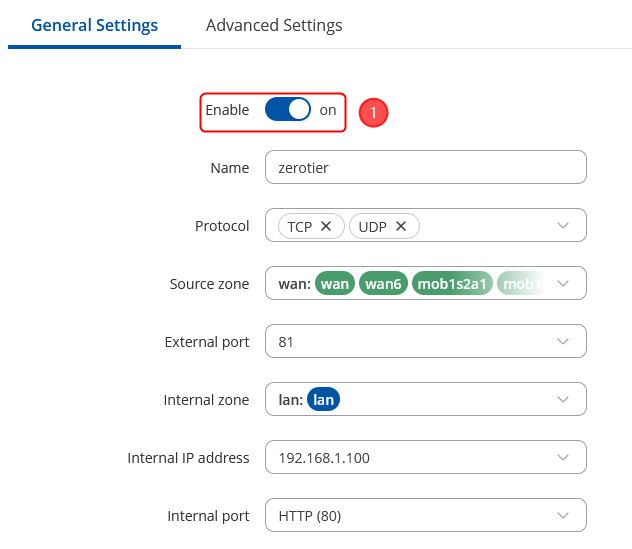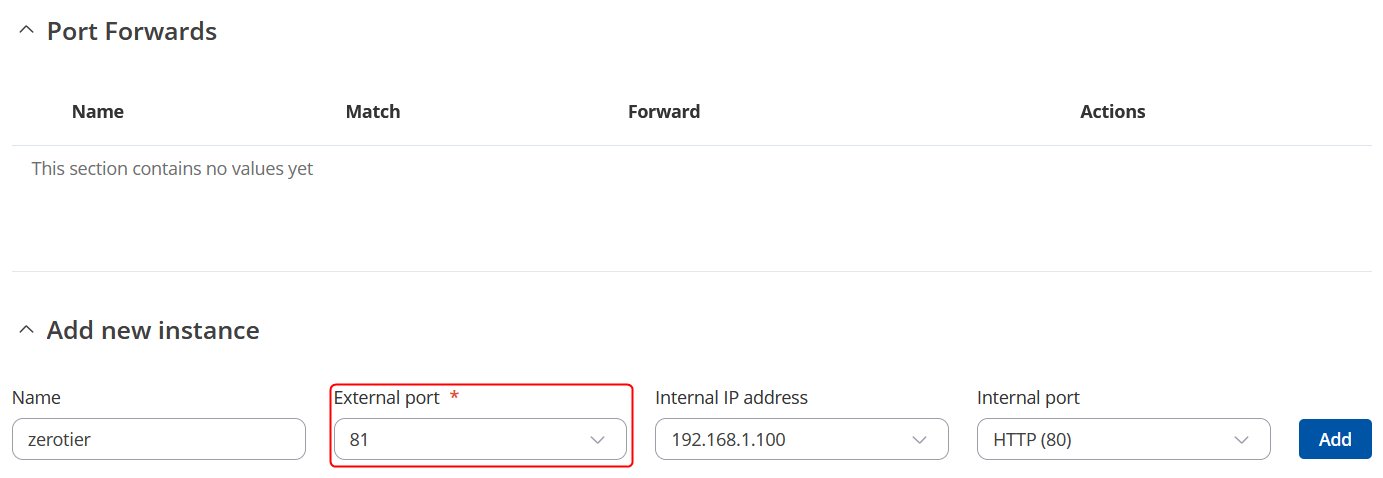 - Since this configuration concerns port 80, the default HTTP port, configuring it like this would eliminate WebUI access to the Teltonika device over the ZeroTier network. To maintain that access, consider using a different external port: