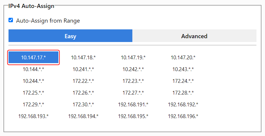 - Scroll down to find the 'IPv4 Auto-Assign' section. Select one of the provided private IP ranges for your network or click 'Advanced' and set up the range manually. For this example we'll be using the 10.147.17.* selection which means our network will be using the 10.147.17.0/24 IP range.